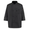 - For comfort and versatility to handle anything that happens in the kitchen, look no further than our Eight Pearl Button Black Chef Coat. Its constructed of our poly/cotton twill blend with a stand up collar and vented cuffs. The coat also comes with a front pocket and thermometer pocket on the are for storage of the essentials.